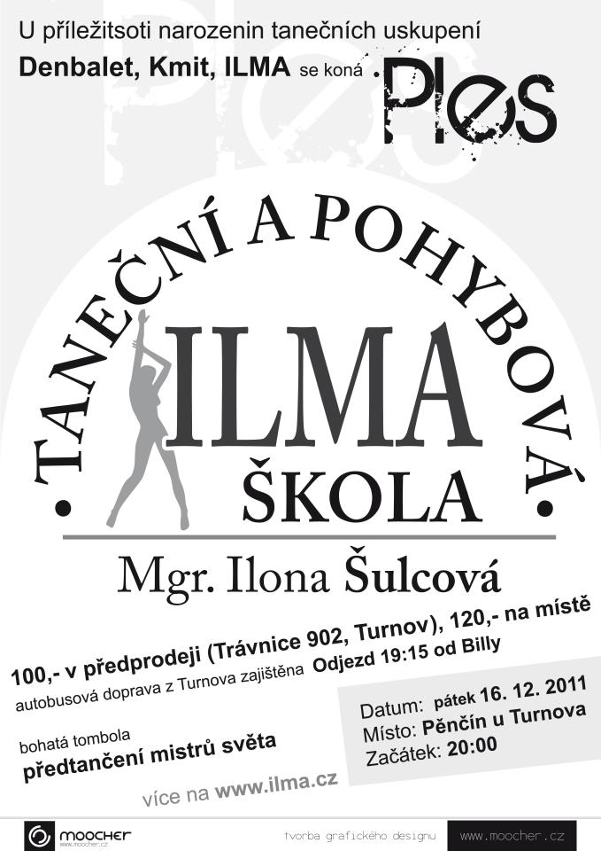 Akce je připravována pro bývalé i stávající členy taneční školy, pro páry z pokračovacích tanečních a tanečních pro dospělé a nebo pro kohokoliv kdo je příznivcem tance a dobré zábavy. Nedílnou součástí tohoto plesu bude také vyjmečná výuka společensky atraktivních tanců, které se dobrovolně může zúčastnit každý. Využijte této události jakožto taneční přípravy na letošní plesovou sezonu. Najědte inspiraci ve vystoupení a skvělé show tanečníků z Taneční a Pohybové Školy ILMA. Těšte se na bohatou tombolu, úžasnou taneční kapelu, skvělou zábavu a v neposlední řadě pivo Svijany